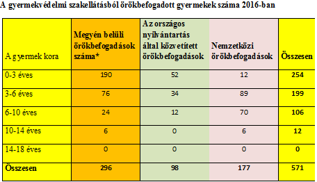 Az alábbi táblázatban az állami gondozásból örökbeadott gyerekek szerepelnek. Leginkább azon gyerekek száma nőtt, akik 6 év alattiak, és a saját megyéjükben, állami gondozásból kerülnek örökbefogadó szülőhöz.