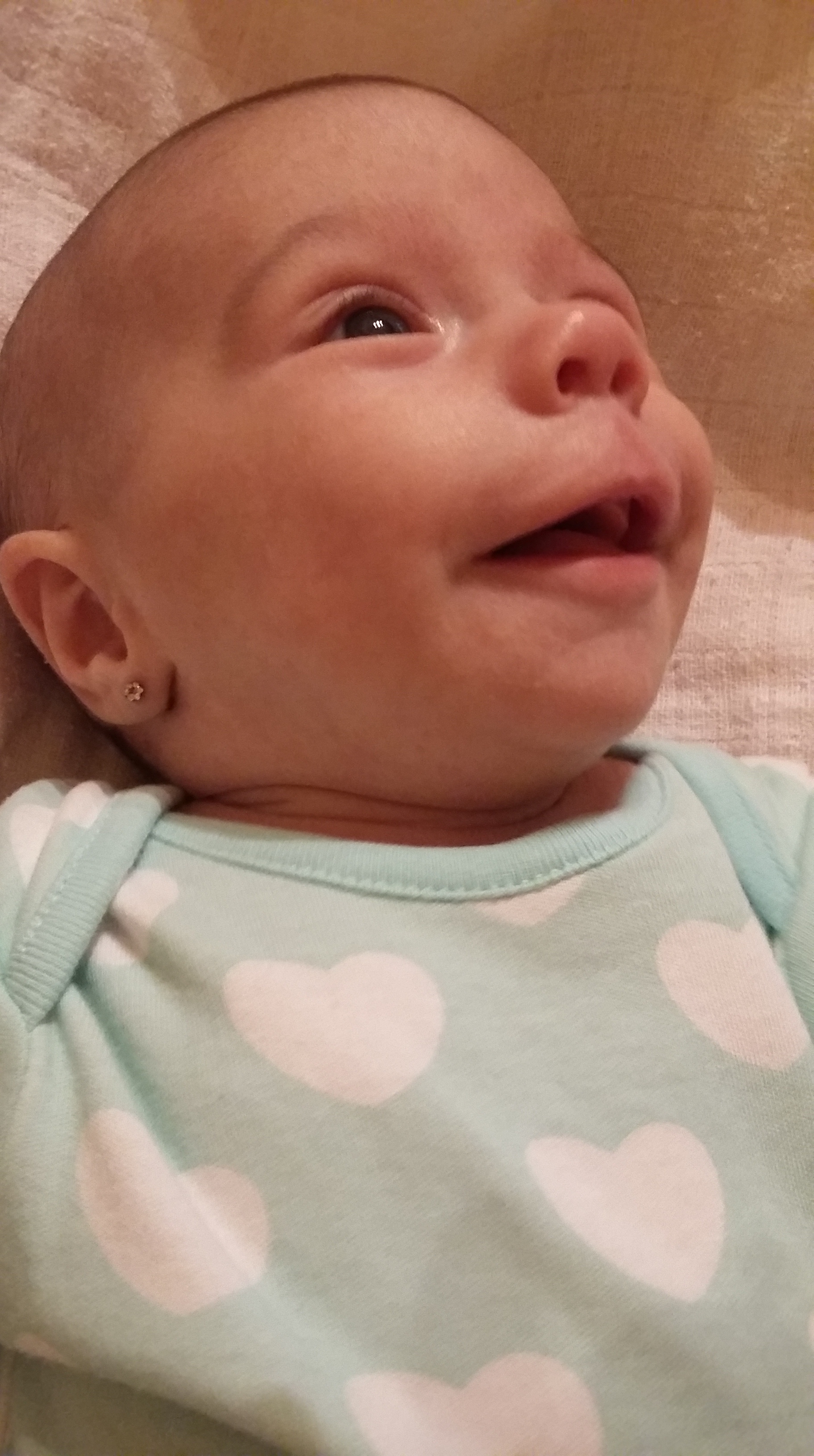 Az az első hónap nagyon nehéz lehetett neki: éppen összevontak két kórházat – tumultus volt. Itthon kb. 3 hónap kellett neki, hogy biztonságban érezze magát – azaz addig szinte csak sírt es evett. De nagyon vigyáztunk rá, megtettünk mindent, s karácsonyra szépen lassan “kisimult”, megnyugodott, s azóta egy örökké mosolygós vidám baba! Többen mondtak, hogy jó a humora – s tényleg hatalmasokat kacag.