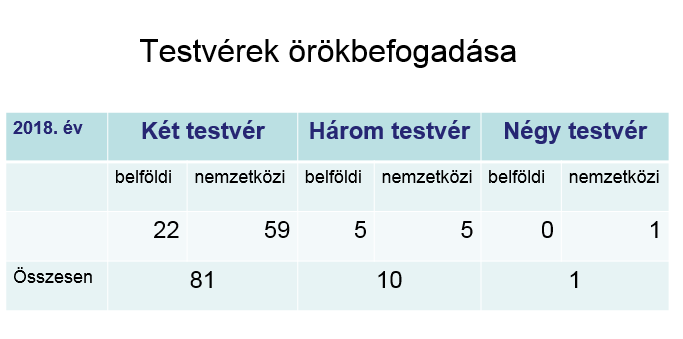 A rendszer igyekszik együtt elhelyezni és együtt örökbe adni a testvéreket, ha ez lehetséges. Ez régóta elv a gyerekvédelemben, a 2020-as törvénymódosítási csomag egy passzusa külön ráerősített erre, kimondva, hogy örökbe fogadható testvéreket, féltestvéreket együtt kell örökbe adni, hacsak ez nem ellentétes valamelyik gyerek érdekével, ha pedig egy testvér később kerül örökbefogadásra, előnyt élveznek a korábbi testvér örökbefogadó, már ha alkalmasak.